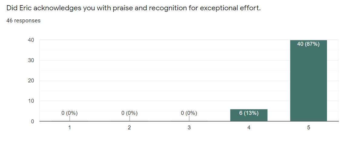 The questions I chose may not be the best questions, especially if you are a statistical analysis expert. However I felt that given my limited experience and limited time to put this together, I gave it my best shot. I have provided below all the responses from the survey as a way of closing the chapter of my manager role and to serve as a decision point as I consider the kind of growth I need to become better leader in the future.