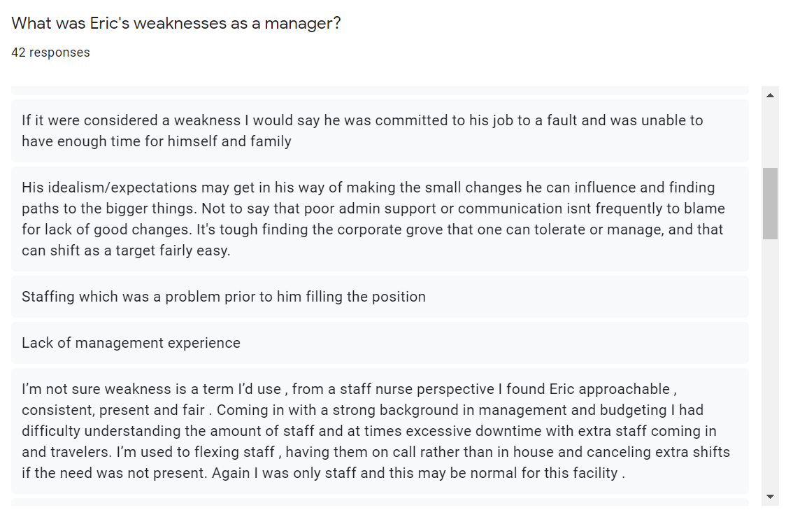 Upon my leaving, I developed a survey which I gave to all my staff and anyone I could think of. I did not provide it to my direct supervisor because in previous conversations I was told that I was not allowed to survey my staff with regard to employee satisfaction. I expected my supervisors involvement would have created more issues for staff who wanted to give feed back. I needed this mirror to reflect how I performed, and to make a plan regarding my future as a leader after such a challenging time.